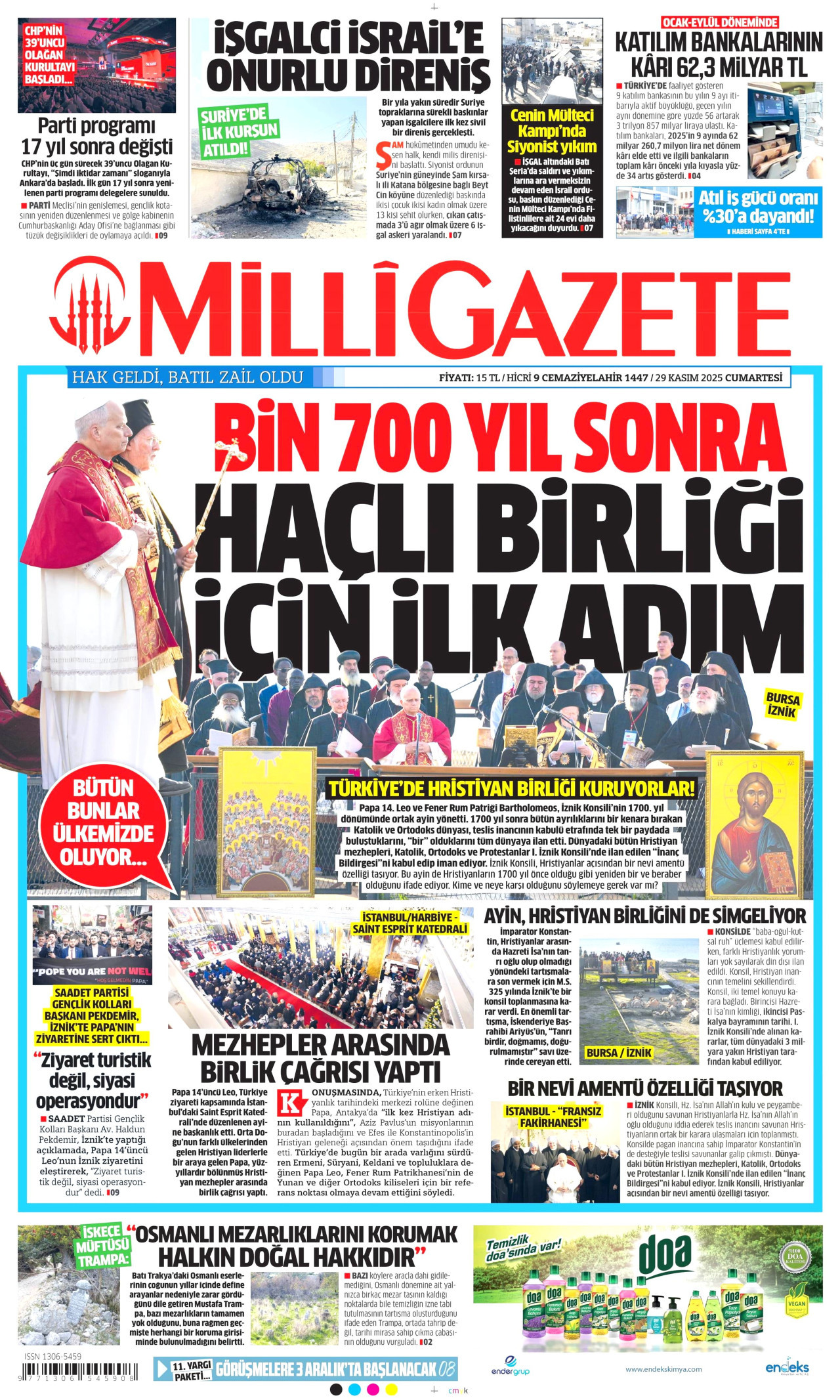 MİLLİ GAZETE Gazetesi 29 Kasım 2025, Cumartesi Günü Manşeti